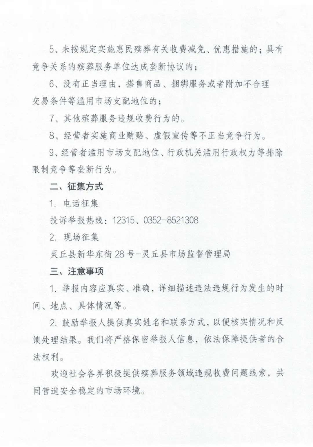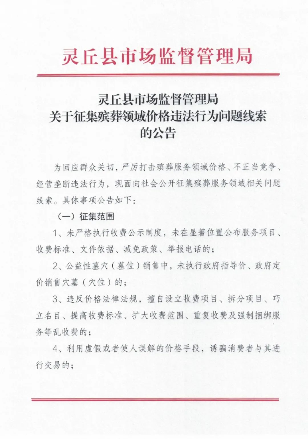 靈丘縣市場監督管理局關于征集殯葬領域價格違法行為問題線索的公告