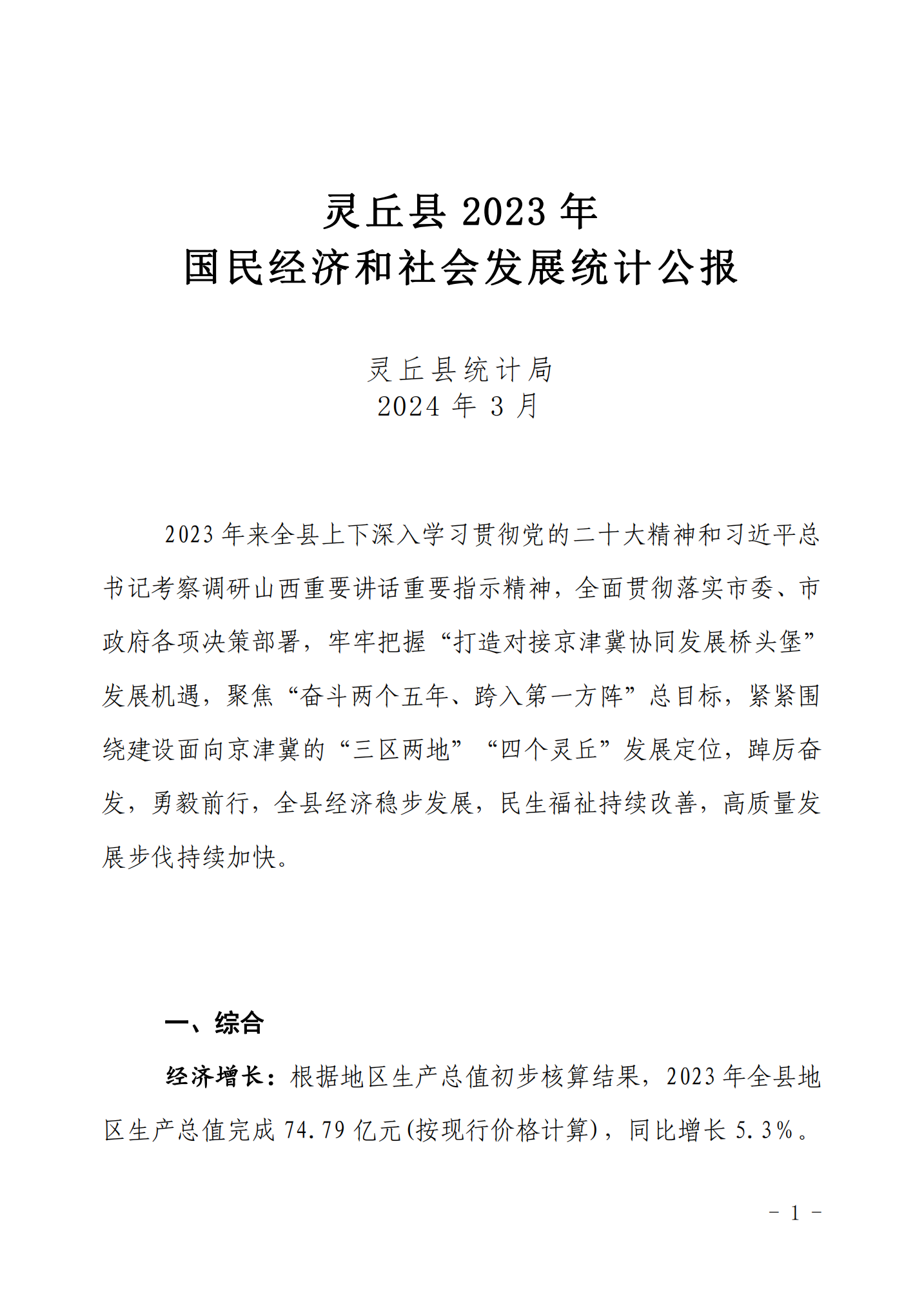 靈丘縣2023年國民經濟和社會發展統計公報